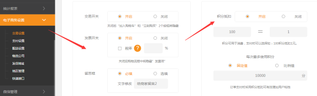 电子商务设置---交易设置中,可以选择是否开启积分抵扣