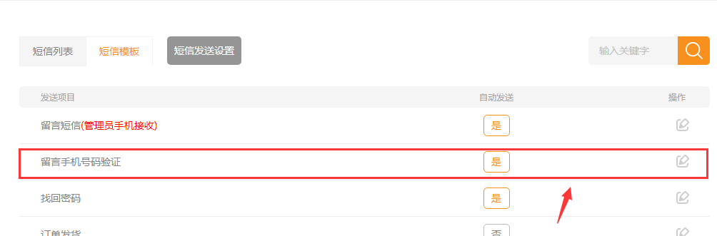 验证需要发送验证短信,所以需要开启认证模板,点击红字处可跳转到后台短信模板处,开启【留言手机号码验证】模板