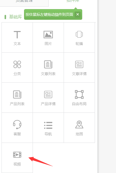 ①.打开插件库,可以看到增加了视频插件,拖到编辑区域