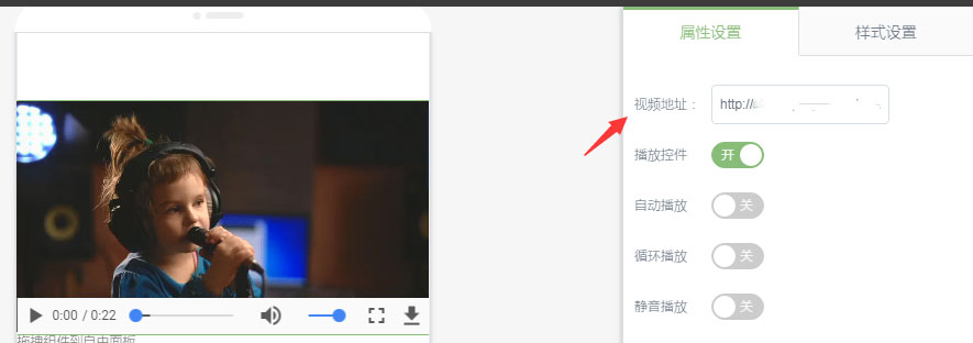 ②.在左侧属性设置输入视频源地址,微信官方规定小程序的视频地址需以源文件链接的地址显示,格式类似www.xxx.mp4 。另外可设置播放控件,声音等