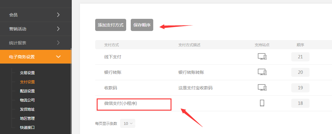 ①.后台---电子商务设置--支付设置里,可以添加支付方式。微信支付指的是前台生成填写的设置,这里会同步前台的填写内容