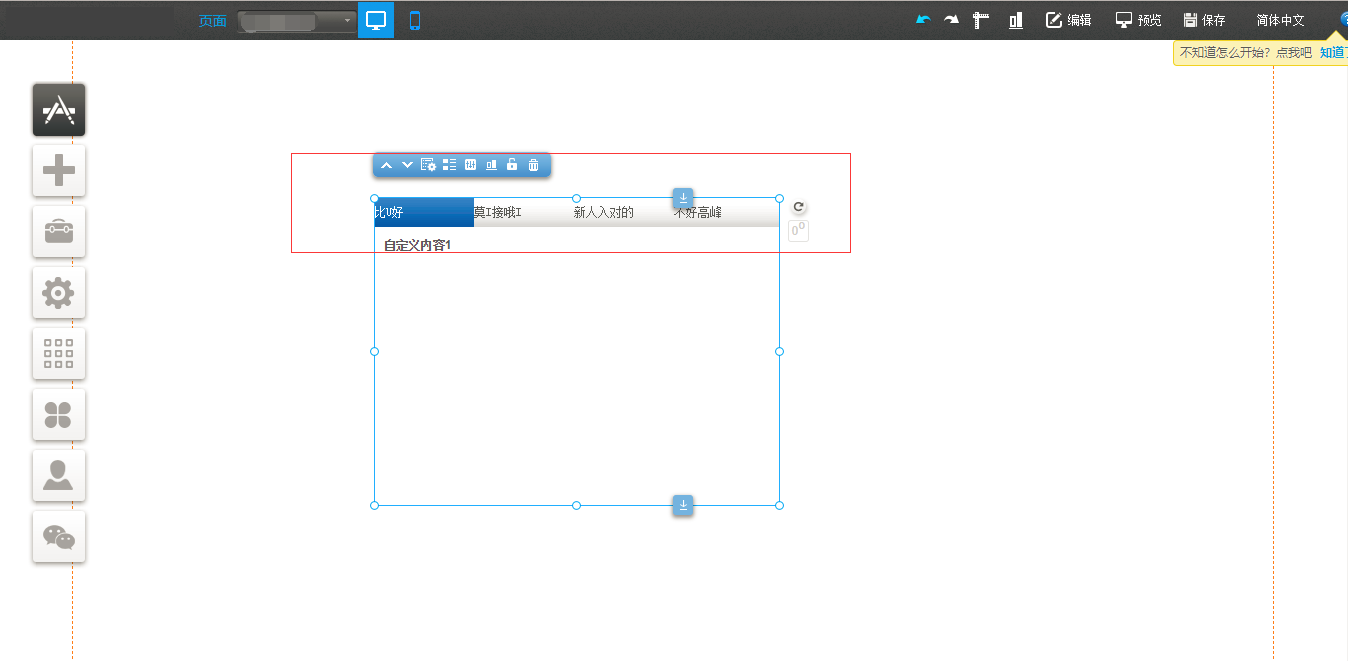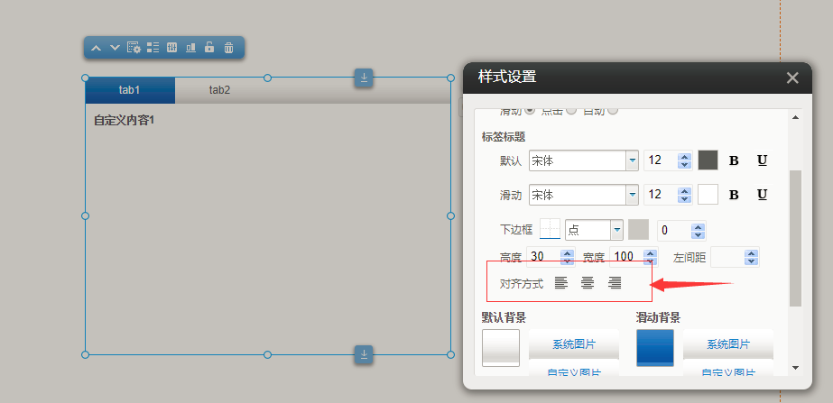 ①. 编辑页面时,选择“选项卡”插件,在“设置”中输入标签名称,然后在“样式设置”中有“居中”“居左”“居右”的选择项,以PC端为例,如图所示: