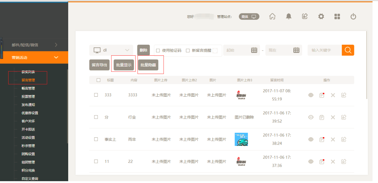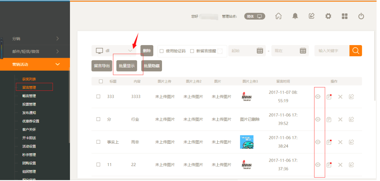 ①.后台“营销活动”中点击“留言管理”,选择需要显示的留言,点击“批量显示”即可,如图: