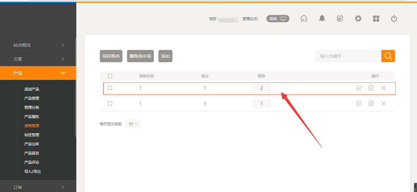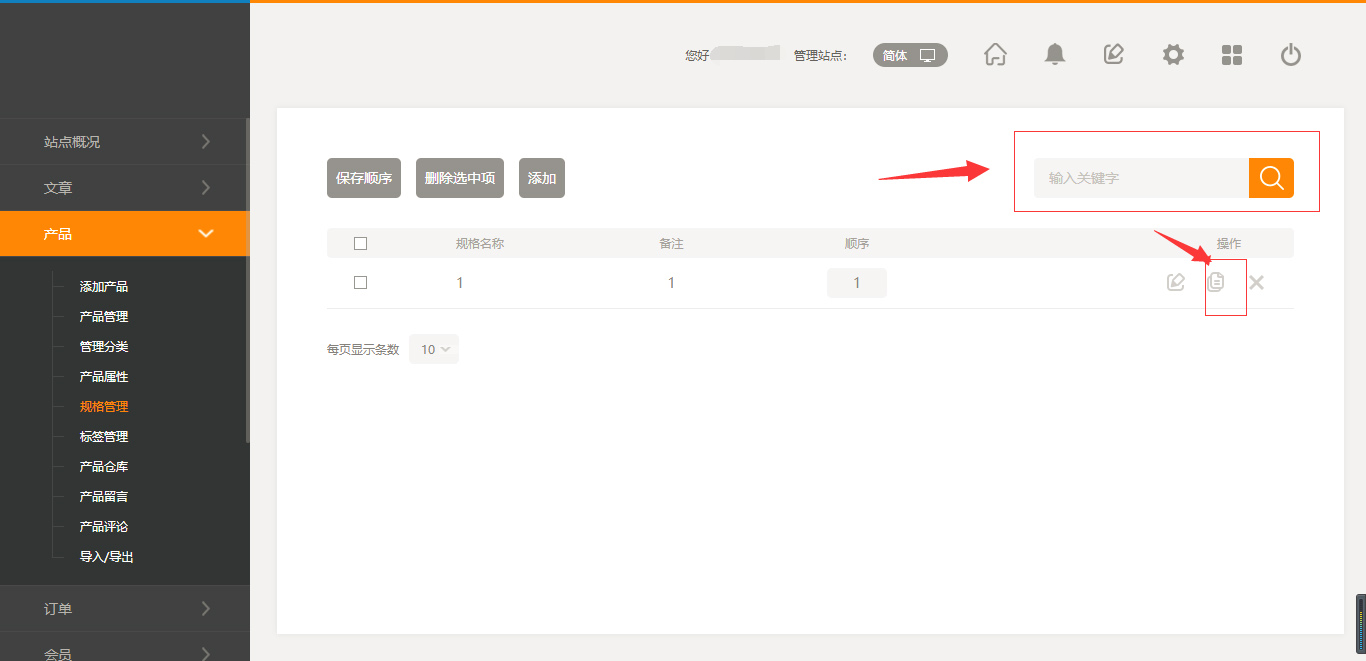 1.以“规格管理”为例:点击“后台管理”-“产品”-点击“规格管理”,点击“添加”,添加完成之后,点击保存,如果需要复制,在“操作”中点击“复制”按钮,然后点击确定即可,也可以在页面的右上方进行搜索功能,如图所示: