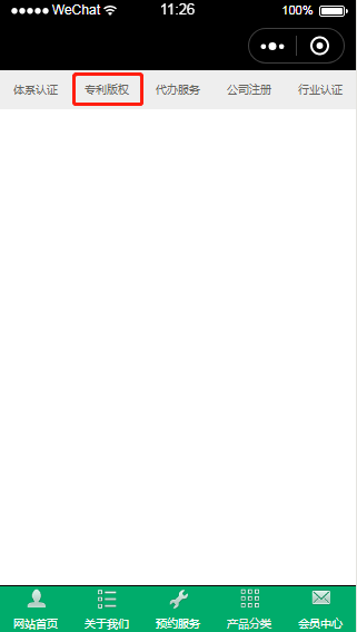 1.点击产品分类打开列表页面,若后台该分类没有添加商品,现在会正确显示“暂无产品”。以分类“专利版权”为例,该分类下无产品。如图所示: