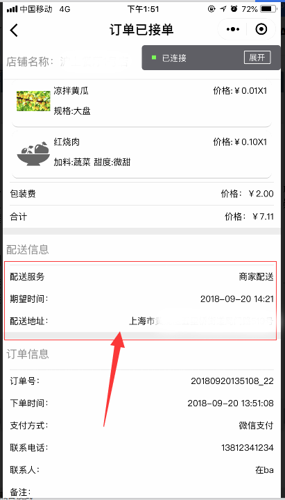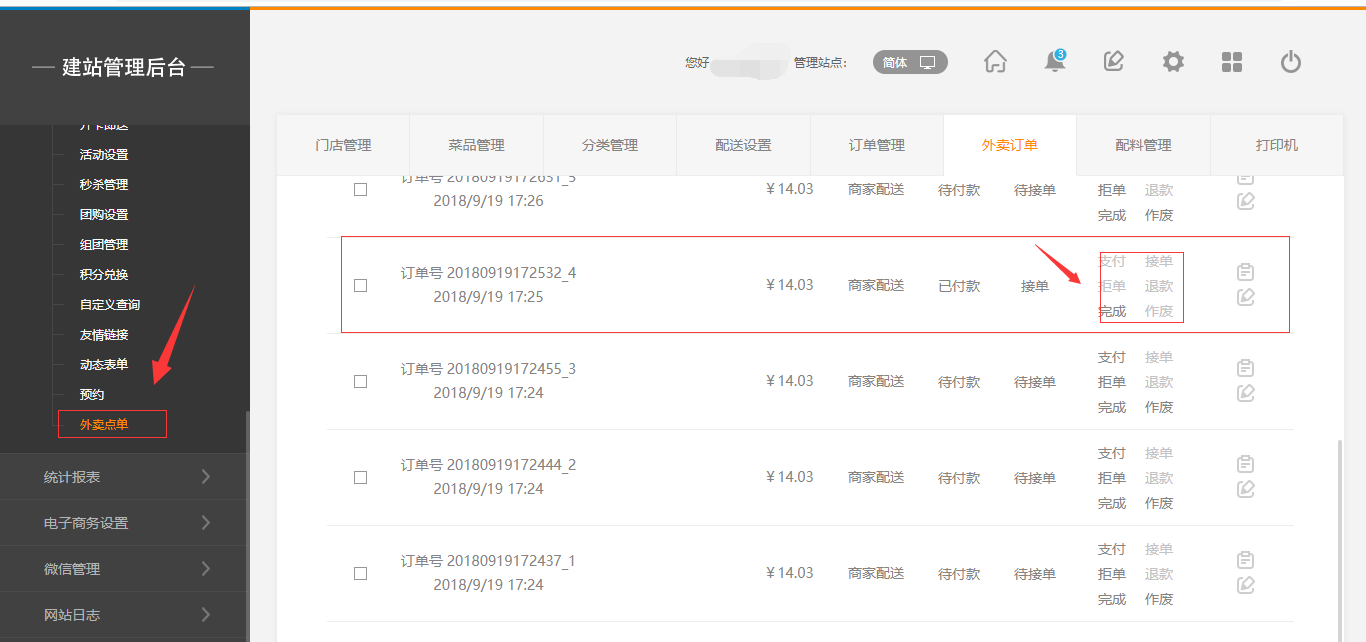 6.选择任意店面,点击进入后,选择相应菜品,点击并购买,若在后台选择的为“自动接单”,则用户付款完成后,后台则会自动接单,打印机也会打出相应的小票,在会员中心中,可以看到相应的订单信息以及配送外卖的信息,在后台,订单接单完成之后,不能进行退款操作如图所示: