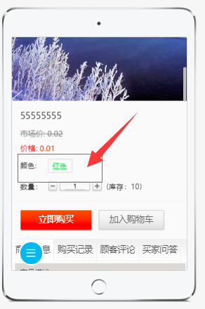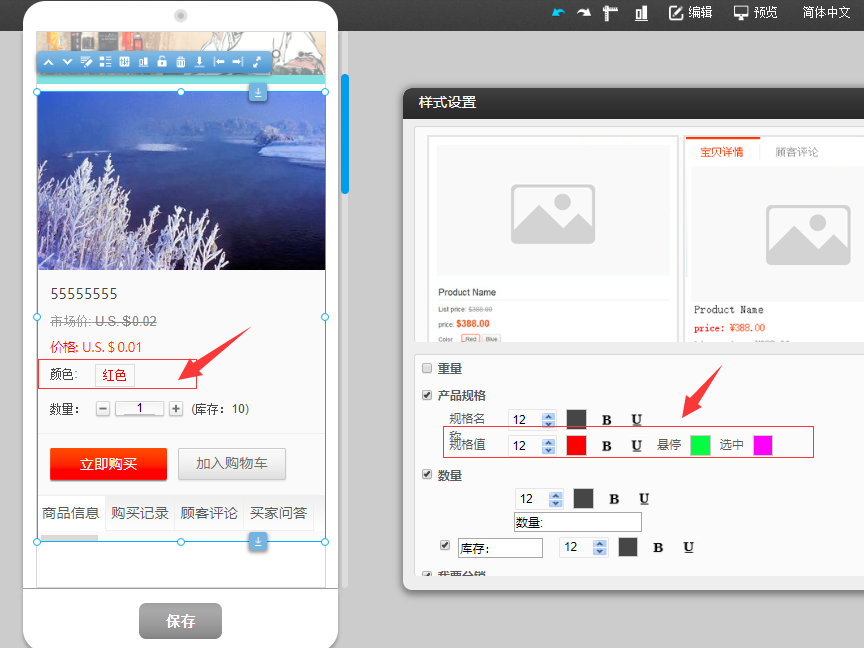 1.编辑器中拖入“产品详情”,选择样式设置-产品规格-规格值,进行设置,设置完成后点击保存即可,如图所示: