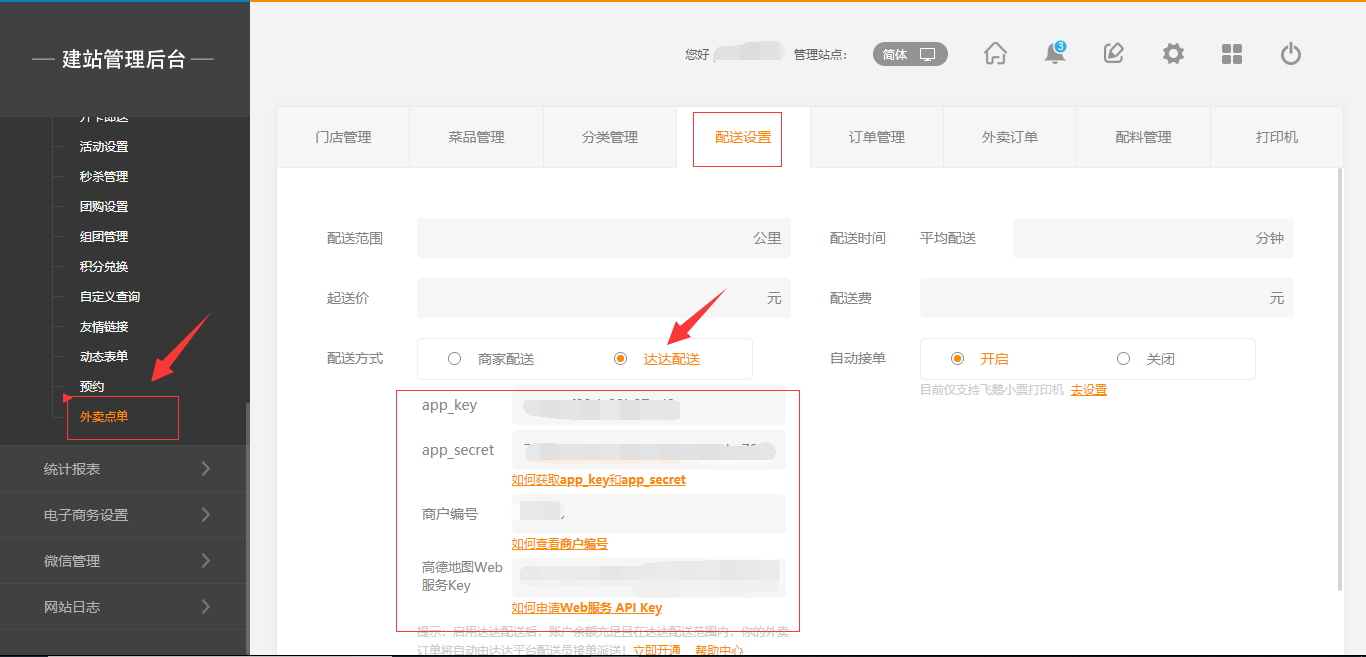 1精工建站后台,首先点击“营销活动”-“外卖点单”-“配送设置”,在配送设置中填写配送信息,配送方式有“达达配送”、“商家配送”,当选择“商家配送”时,请填写“配送范围”、“起送价”、“配送时间”、以及“配送费”填写完毕后点击保存即可;当选择“达达配送”时,需要填写相对应的信息及配送价,具体操作可以点击链接进行查看,编辑完成之后,请点击保存,如果需要自动接单,也可以开启自动接单,当前台用户付款完毕后,后台将会自动接单,如图所示: