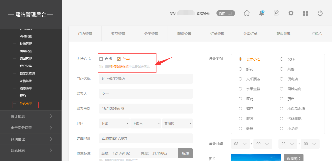 2.点击“门店添加”,可以选择“自提”与“外卖”(注:支持多选与单选),选择完毕后,填写页面相关信息,点击保存即可,如图所示: