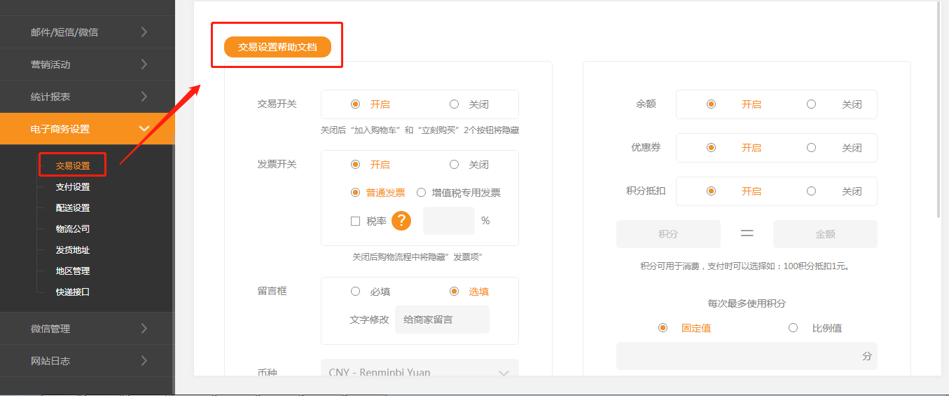 1.建站后台-“电子商务设置”-“交易设置”页面,增加了系统性的帮助文档。如图所示: