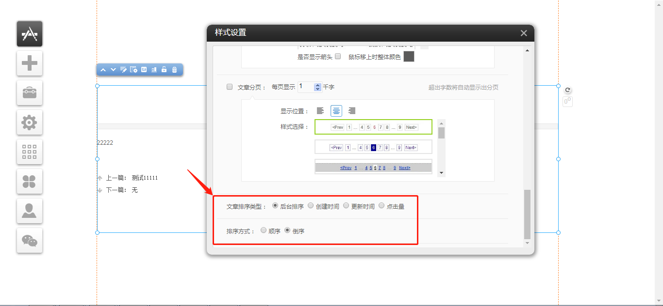 1.建站前台编辑时,文章详情插件的样式设置中,添加了文章的排序功能。如图所示:
