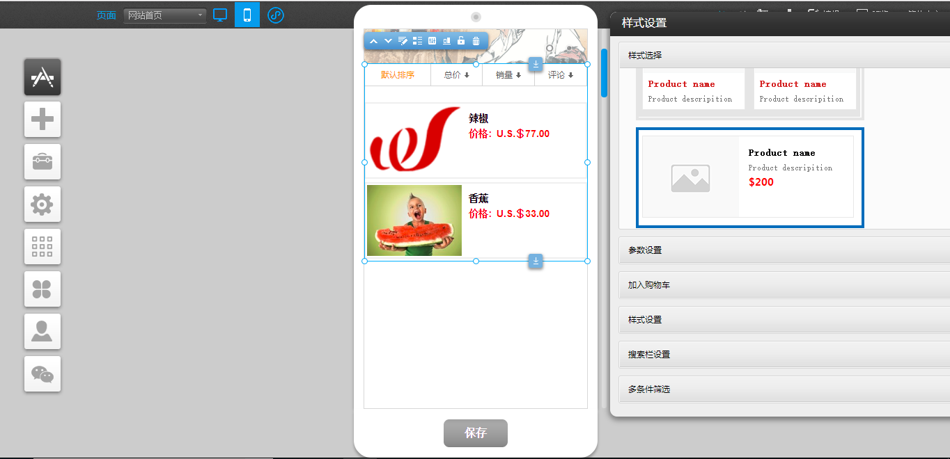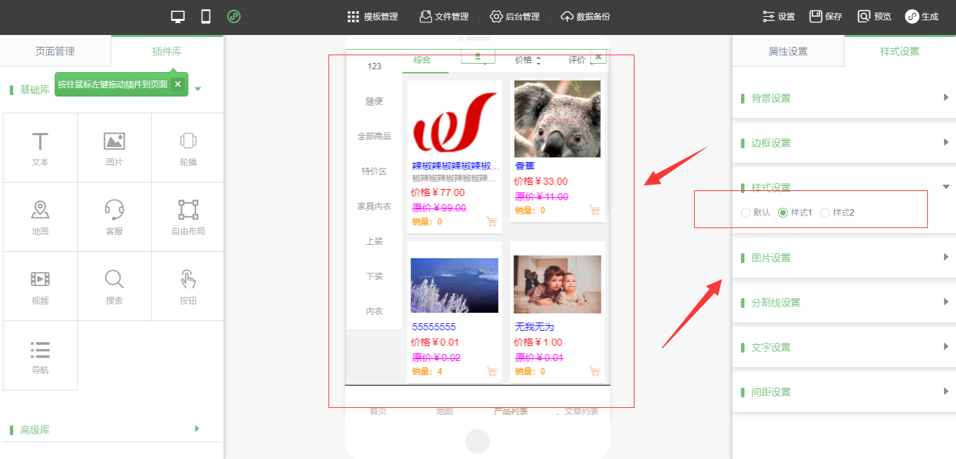 1.在小程序编辑器中,拖入“产品列表”插件,在“样式设置”中新增了样式一与样式二(注:不更改的情况下为默认样式),如图所示: