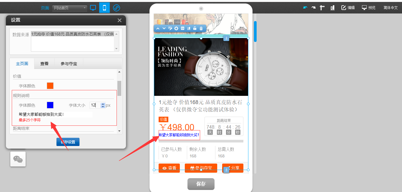 1.在编辑器中,拖入“微夺宝”插件,在“设置”-“规则说明”中,可以修改规则的文字,多25个字符,如图所示: