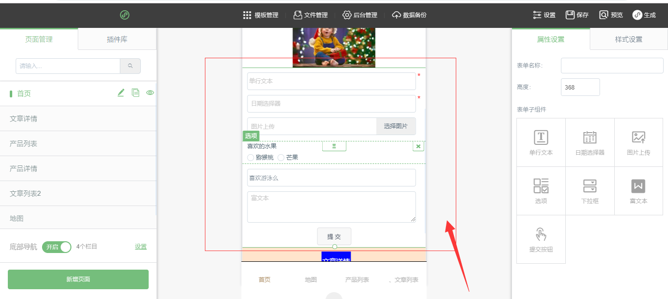 1.编辑器中点击“表单”插件,拖入需要的表单内容,保存并点击发布即可,如图所示: