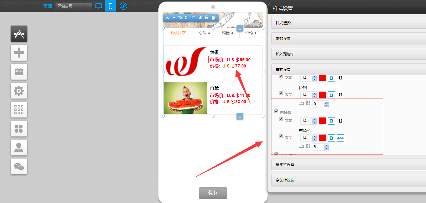 1.编辑器中拖入“产品列表”插件,选择相对应的样式,在“样式设置”中勾选“市场价”进行设置即可(默认状态为不勾选),如图所示: