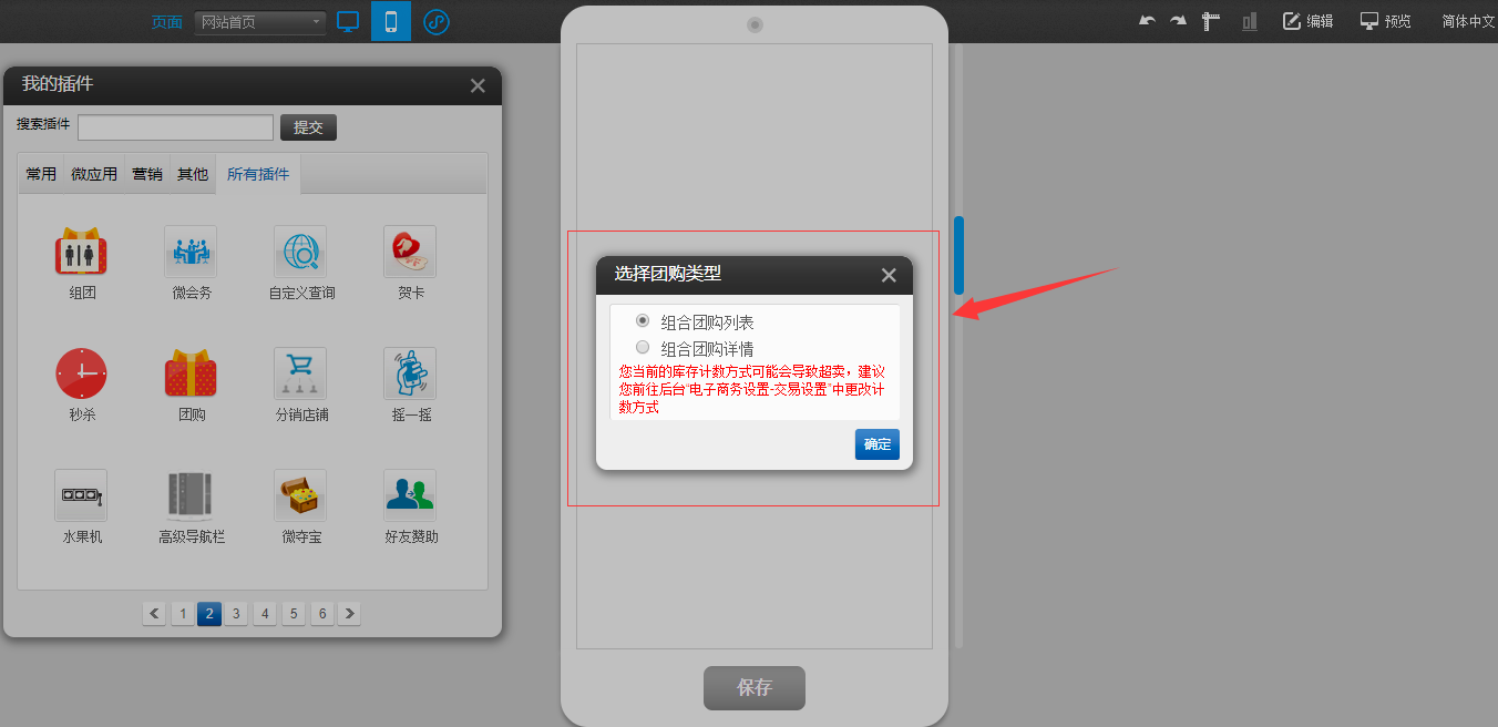 1.后台,“电子商务设置”-“交易设置”-“库存计数”中选择“发货立减”和“付款立减”时,在前台PC(、团购)、手机(、团购、组团)插件拖入时会有提示信息,如图所示: