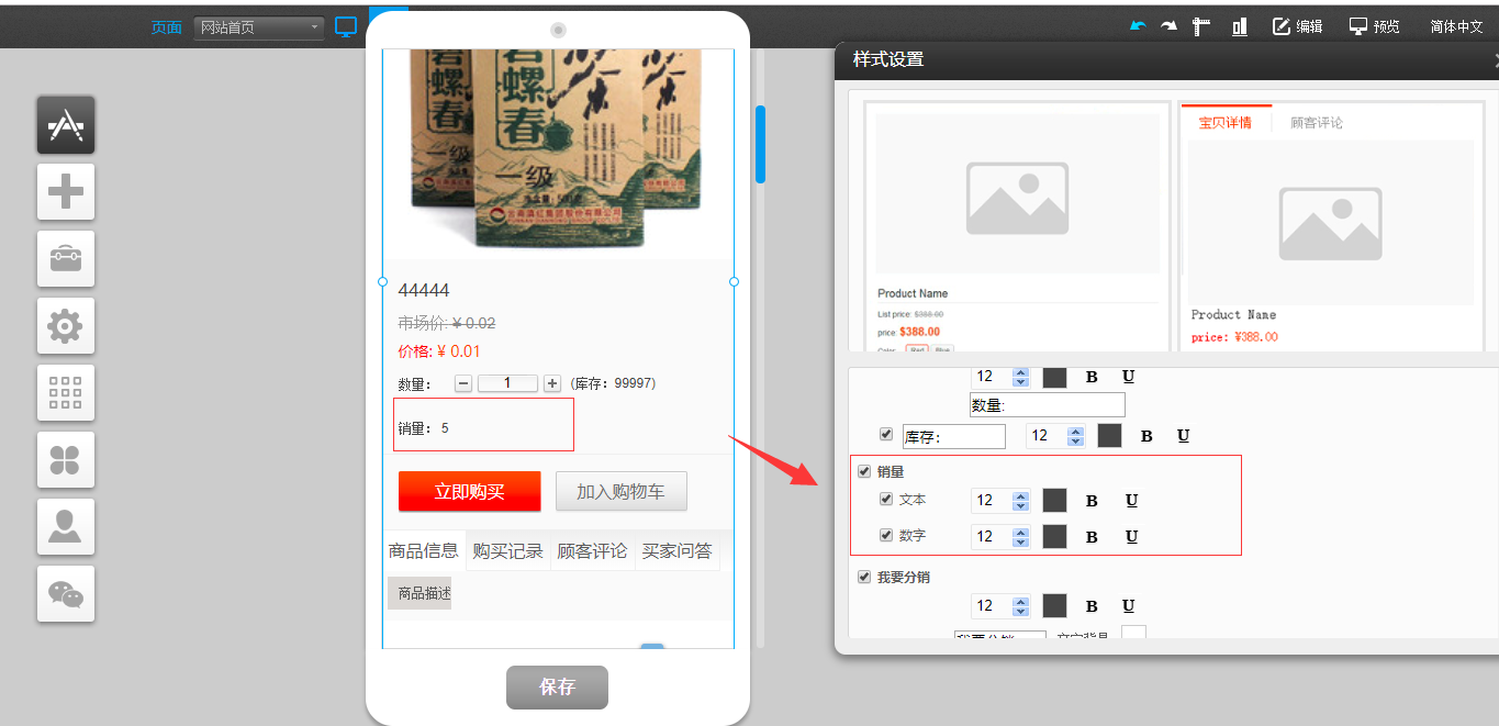 1.在编辑器中拖入“产品详情”插件,点击“样式设置”,勾选“销量”即可,如图所示:
