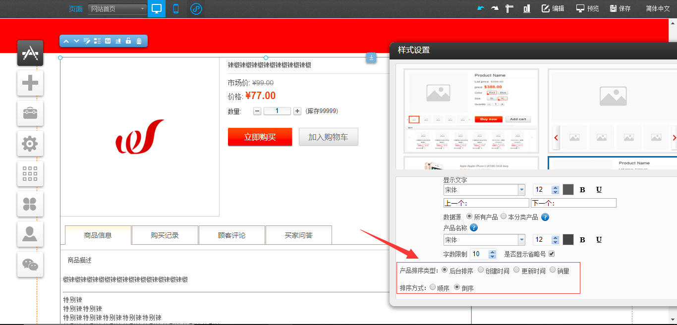 1. 已PC版为例,在编辑器中拖入“产品详情”插件,“样式设置”中新增“产品排序类型”与“排序方式”,如图所示: