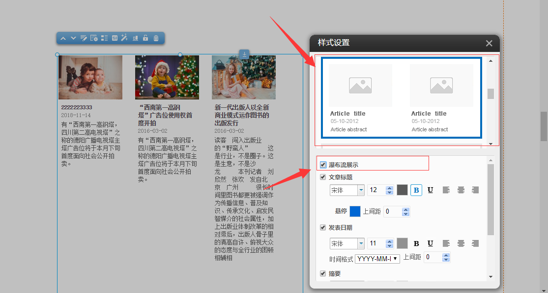 2.拖入“文章列表”插件,选择该样式后,勾选“瀑布流”即可,如图所示: