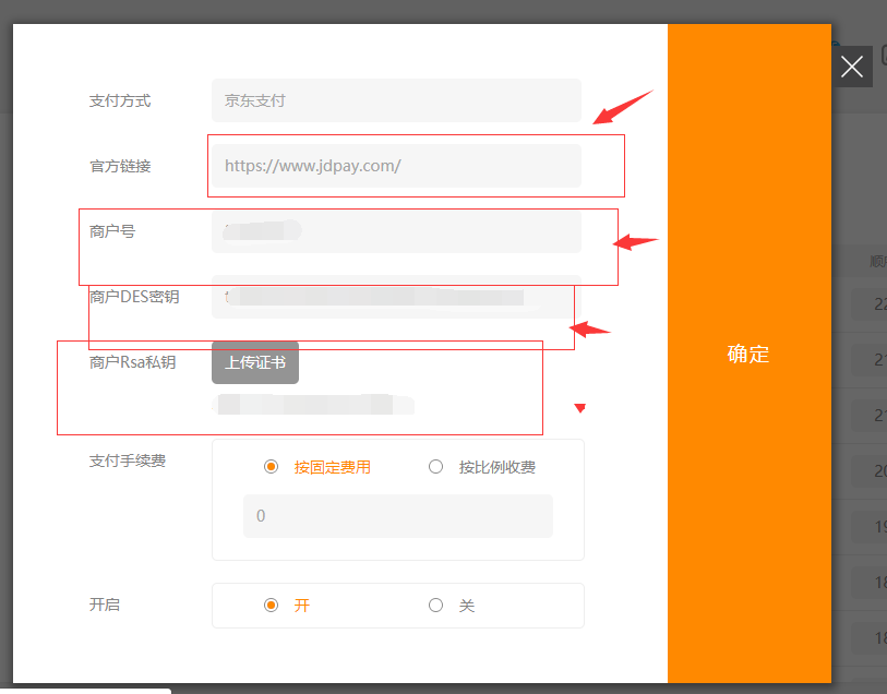 1.后台-“电子商务设置”-“支付设置”-“京东支付”,点击“编辑”,通过官方链接进行商户账号申请后(注:请选择快捷支付)根据京东支付网站中申请提示进行操作,将得到的商户号、密钥等信息填写完全,并上传证书后将其开启,点击保存即可,如图所示: