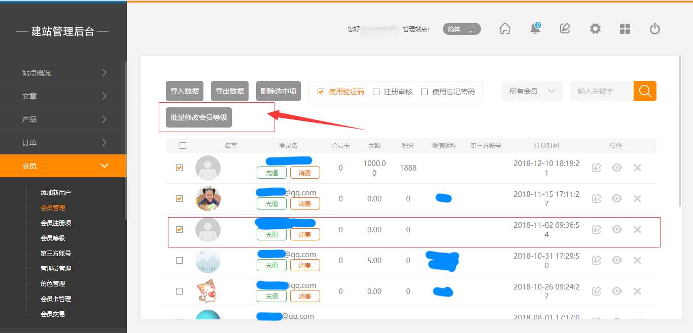 1.在后台-“会员”-“会员管理”中选择需要更改等级的用户,然后点击批量修改等级,选择需要修改的等级即可,如图所示:
