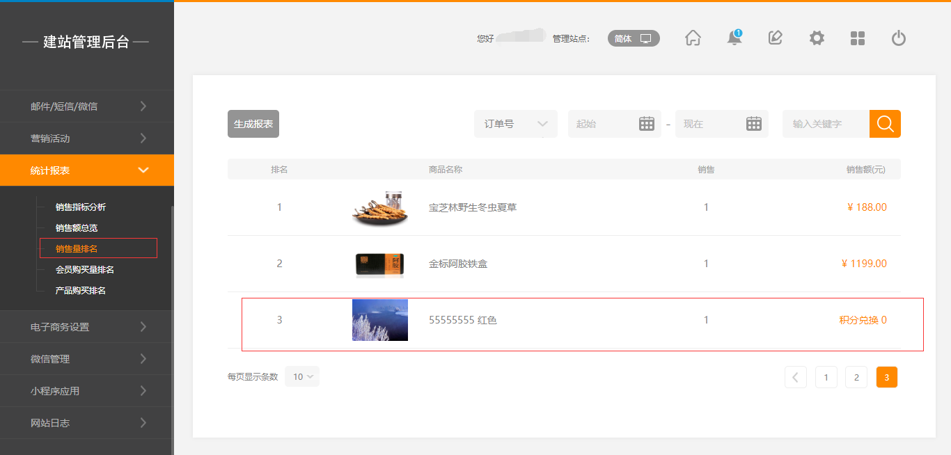1.点击后台管理,“统计报表”-“销售量排名”中将积分产品区分出来,统一放在列表的并标识“积分兑换”,如图所示: