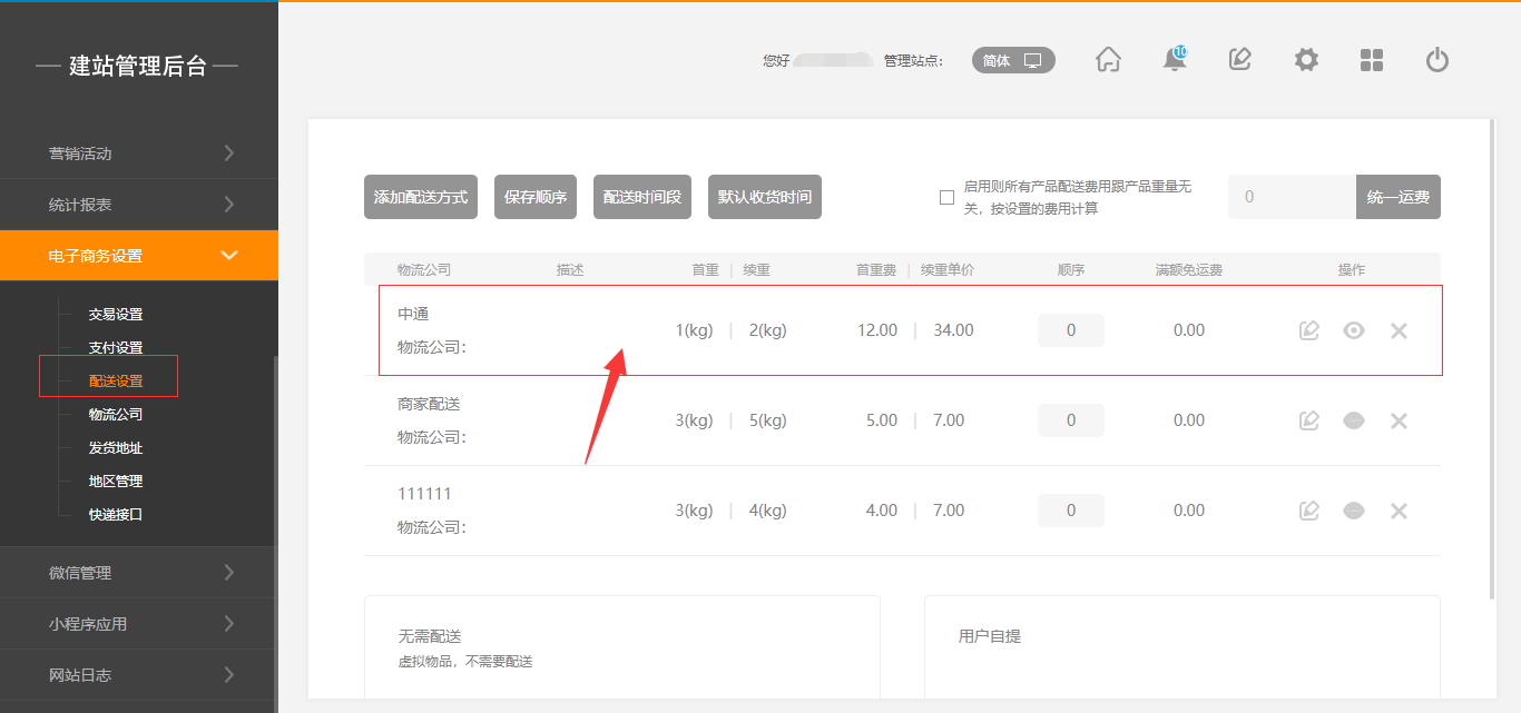 1.网站后台中“电子商务设置”-“配送设置”中,若配送方式只有一个的情况下,前台提交订单页面会自动显示,不需要进行选择,如图所示: