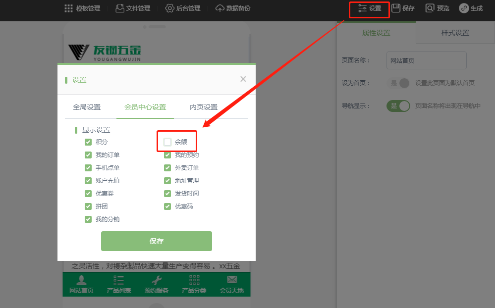 1.点击建站前台的“会员弹窗”,在模块显示中新增了余额模块,不勾选该模块,则该模块将在会员中心隐藏,如图所示: