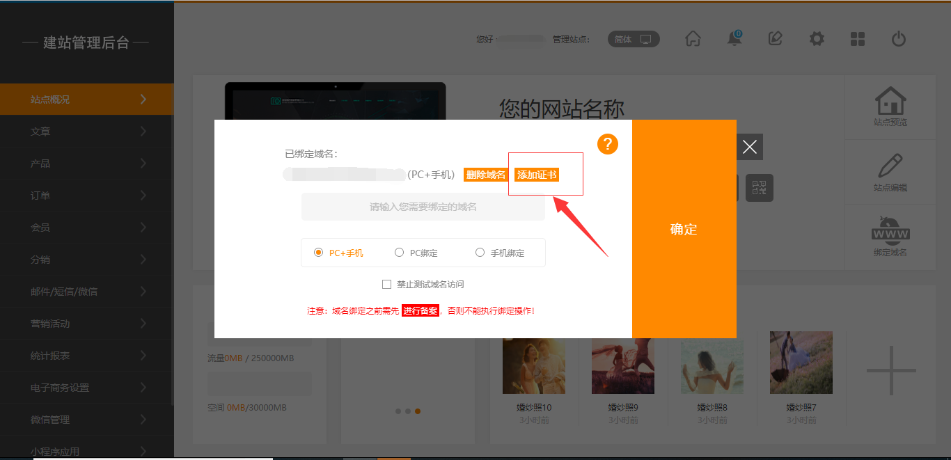 1.在后台,“站点概况”点击“绑定域名”-“添加证书”,将证书添加完毕后保存即可,需要注意的是,如果将该域名删除,则证书同样会被删除,如图所示: