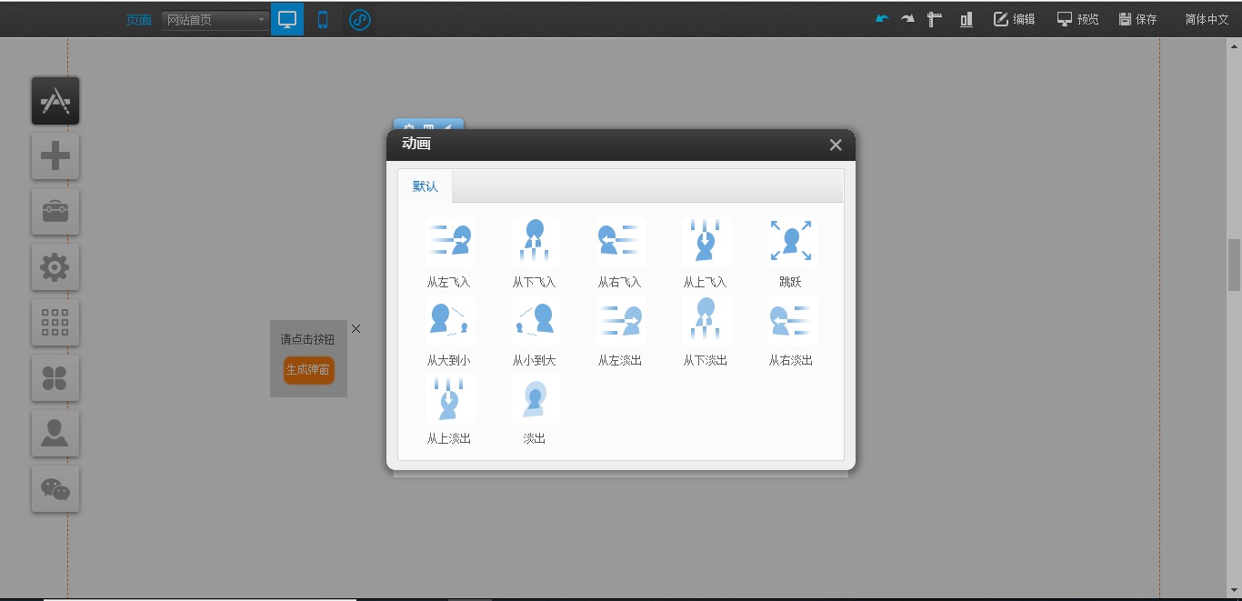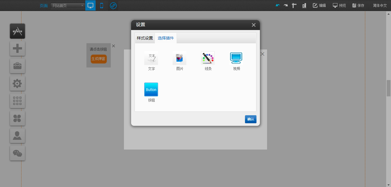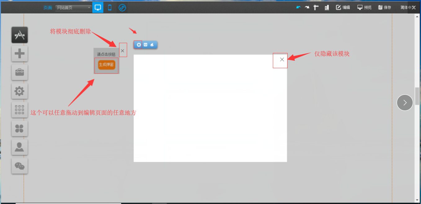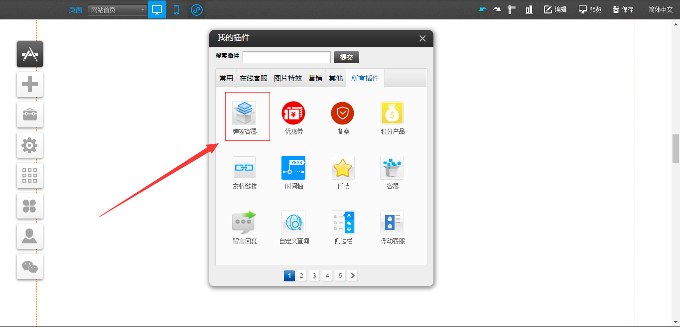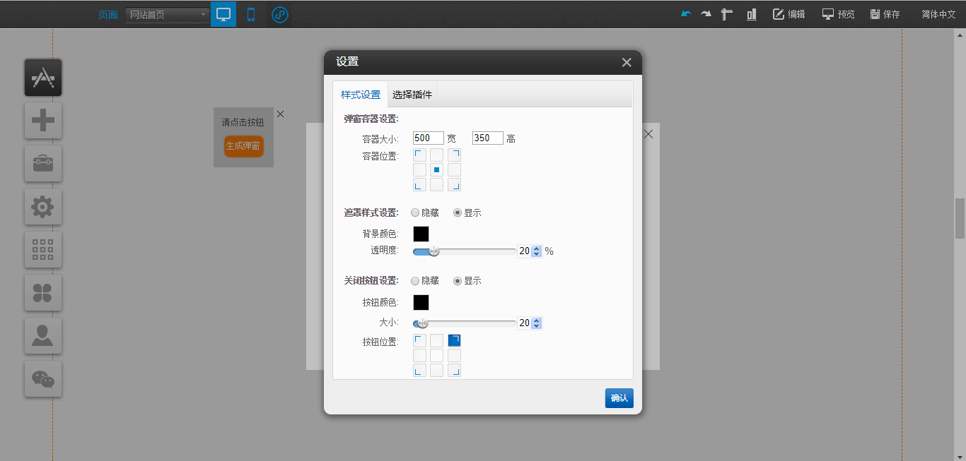 1.在PC编辑器中,点开“插件”,拖入“弹窗容器”插件,点击“生成弹窗”,在“弹窗容器”中点击“样式设置”可以对该容器的大小、关闭按钮样式以及遮罩样式进行设置,点击“选择插件”对可以拖入“文本”、“图片”、“视频”、“线条”以及“按钮”插件,“动画设置”是可以对该模块的展现形式进行设置,编辑完成后点击白色容器的“X”只是暂时在编辑器中隐藏了该编辑模块,如果需要彻底删除,需要在“生成弹窗”处关闭,并且支持将“生成弹窗”任意拖动到编辑器中的任意地方放置,如图所示: