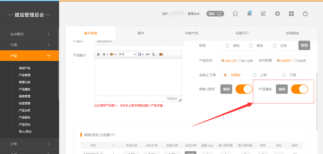 1.在后台中添加产品时,将已经添加好的“产品属性”选择完成,然后再编辑器中的“产品列表”中开启“多条件筛选”并将“多选”“更多”选择为“显示”状态(默认为不显示),然后点击保存即可,如图所示: