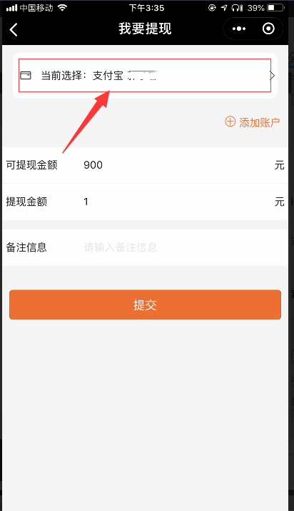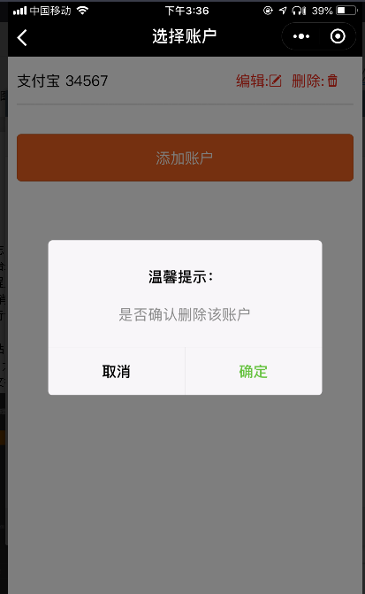 1. 在分销店铺中,点击“我的”-“立即提现”选择提现得账户,点击后,可以对已添加的账户进行修改和删除的操作,如图所示:
