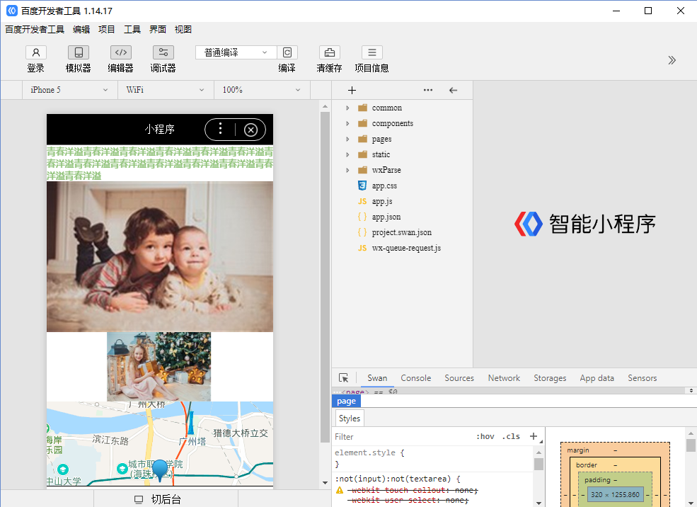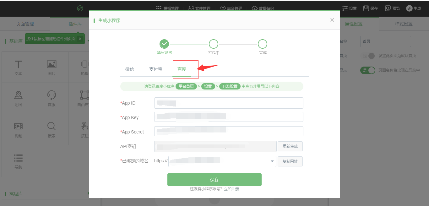 4.在小程序编辑器中,拖入插件后,点击生成,选择“百度小程序”下载代码(注:在编辑器中布局页面时注意“地图”、“视频”、“web页面”为原生组件因此会对其他插件有覆盖的情况!),在百度小程序开发者工具中选择“打开”文件夹即可,如图所示: