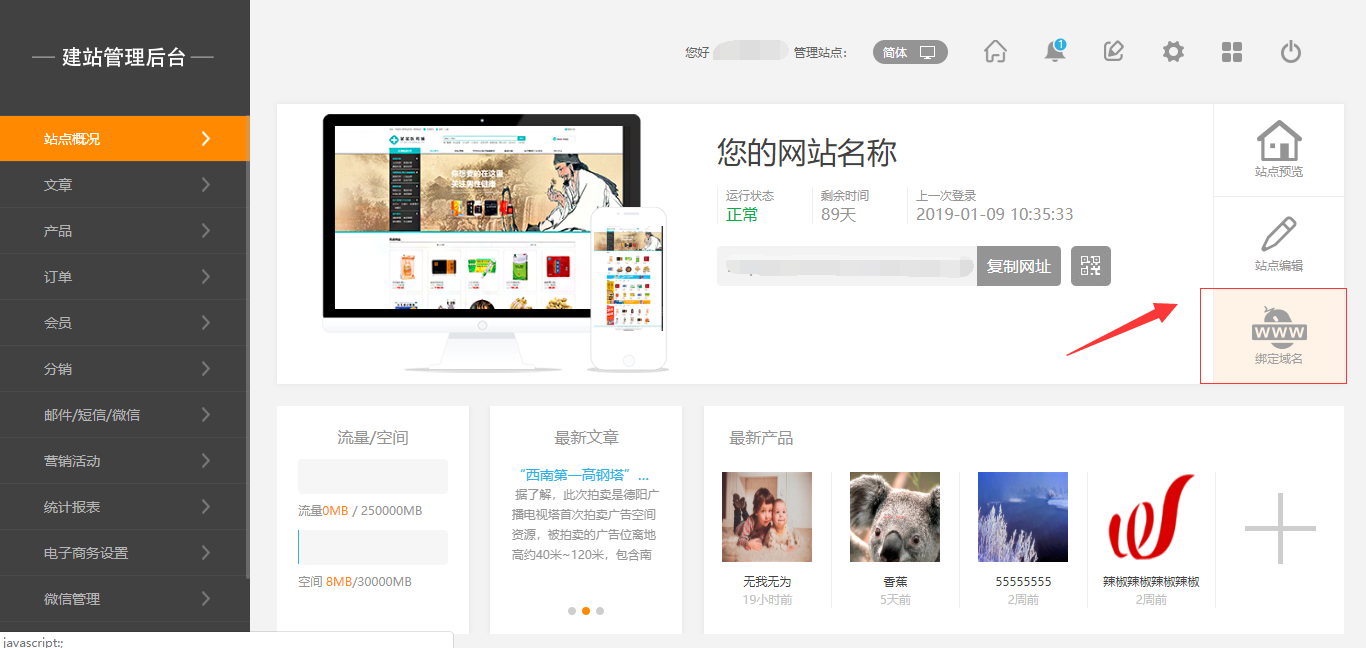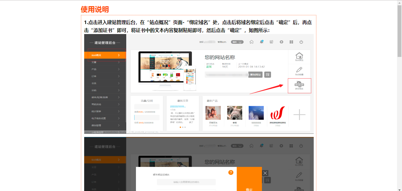 1.在后台中“站点概括”中,点击“绑定域名”中的“?”图标,可以直接跳转到该帮助文档页,如图所示: