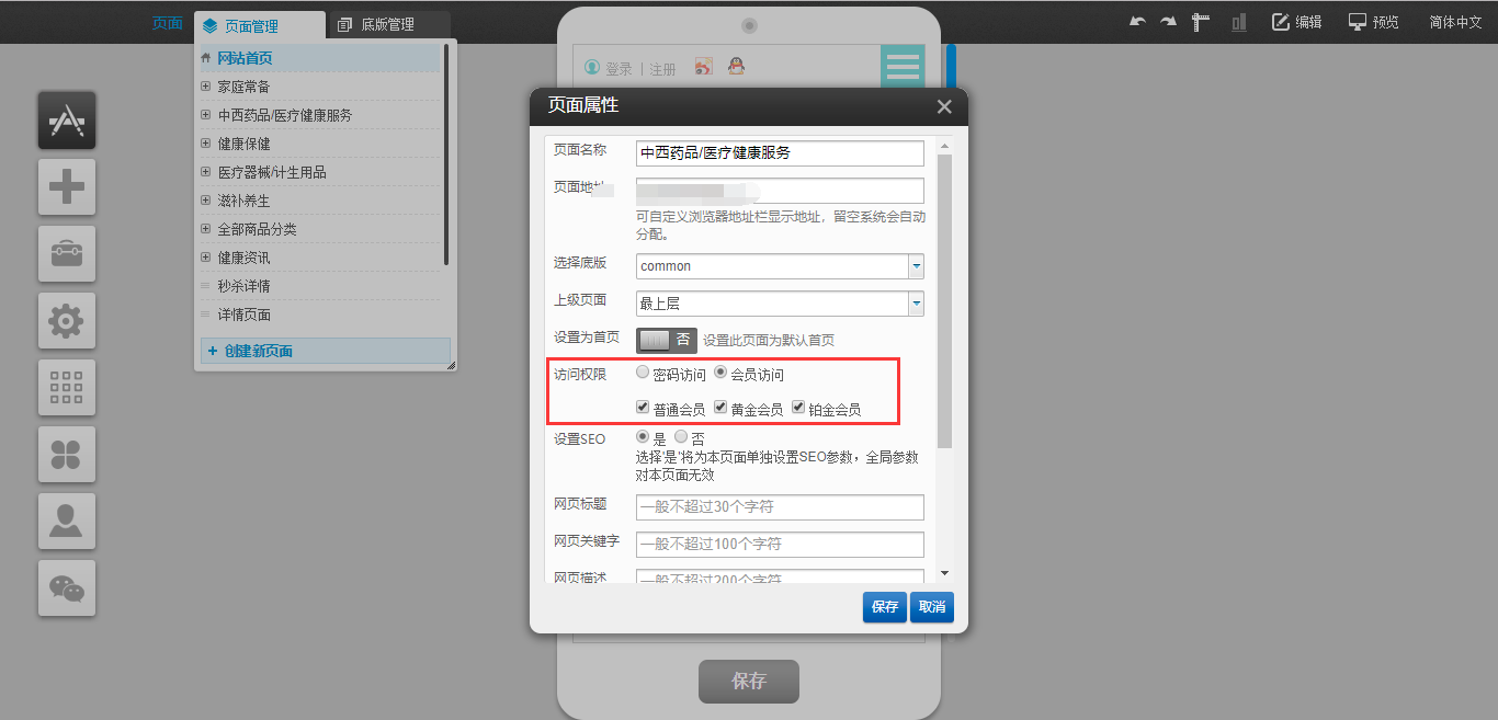 1.在编辑页面,点击“页面”-“属性”-“权限访问”选择需要访问的会员等级,并在后台“会员”-“第三方账号”绑定相应的账号,如图所示: