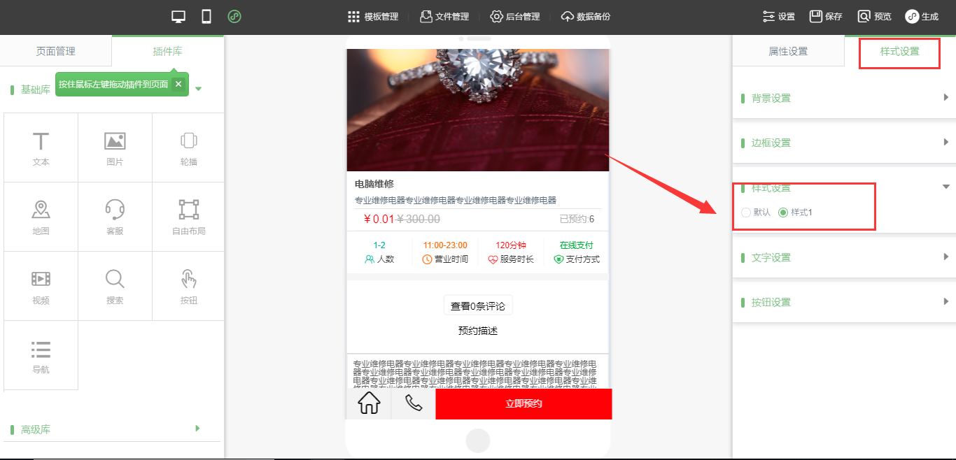 1.在小程序编辑器中,拖入“预约列表”与“预约详情”页面,在“样式设置”中可以选择列表与详情的样式,列表新增两种样式,详情新增一种样式(注:更换新的样式后请重新生成代码并发布小程序),如图所示: