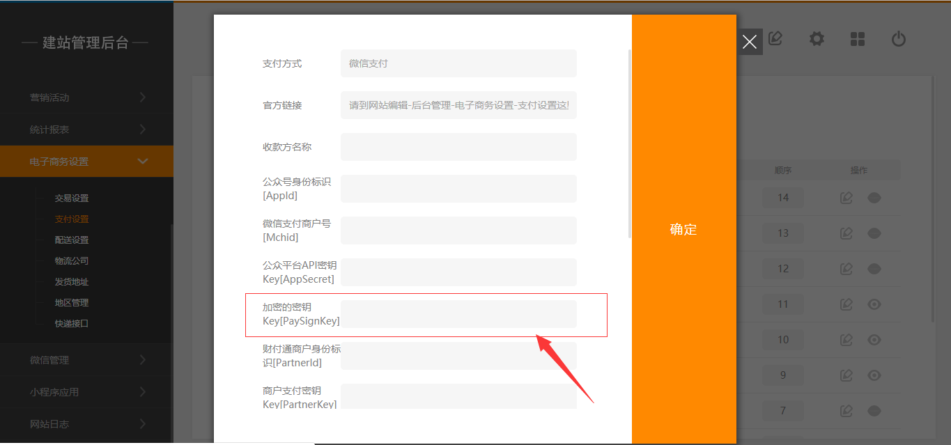 1.在后台-“电子商务设置”-“支付设置”-“微信支付”中将“加密的密钥”填写项删除,如图所示: