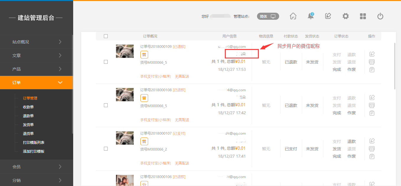 1.在后台点订单管理中,订单管理的用户信息中新增显示会员的微信昵称,如果未获取到该会员的微信昵称,则不显示,如图所示: