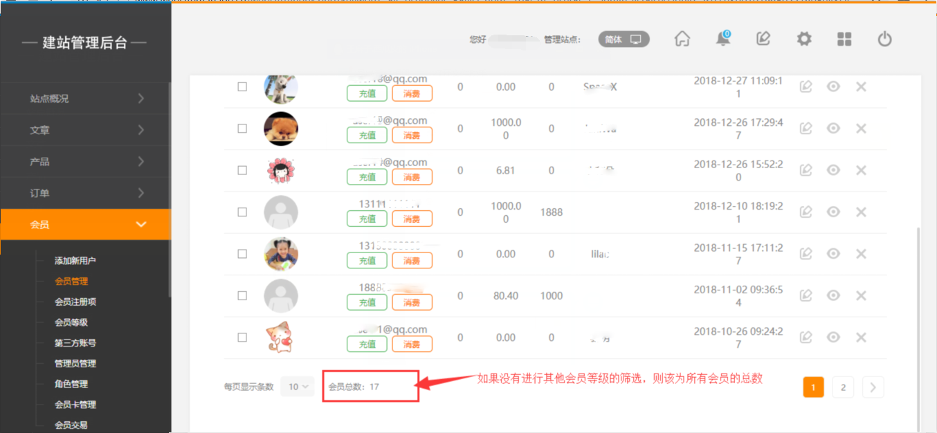1.在后台会员管理中,增加了会员的总数显示,未做其他会员等级筛选操作时,显示为所有会员总数,否则则显示为该会员等级的会员总数,如图所示: