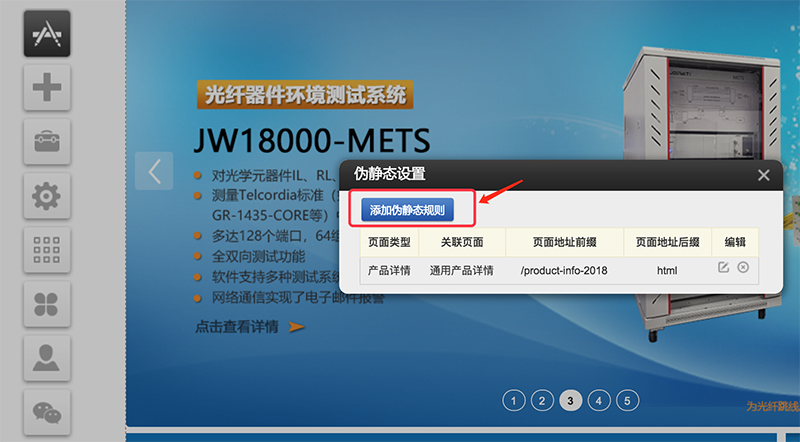 1.以PC端文章详情为例,首先在编辑器中点击“设置”-“伪静态设置”,点击“添加伪静态规则”,选择页面类型“文章详情”或者“产品详情”,选择关联页面并填写页面地址前缀,都为必填项,页面地址后缀可二选一,填写完成后点击保存即可,如图所示:
