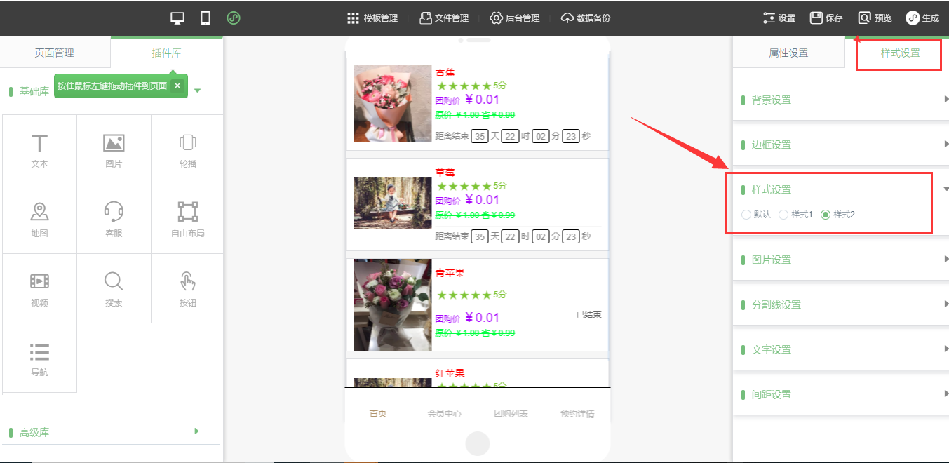 1.在小程序编辑器中选择团购列表插件,在“样式设置”中新增了样式一与样式二,选择后在进行其他设置项的操作即可,如图所示: