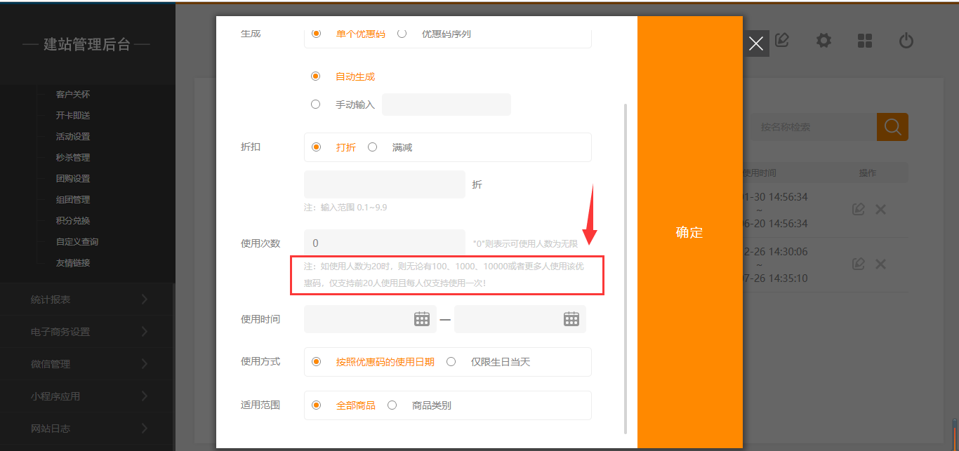 1.在后台,点击“营销活动”-“优惠码”-“生成优惠码”中的“使用次数”添加了文字帮助,如图所示: