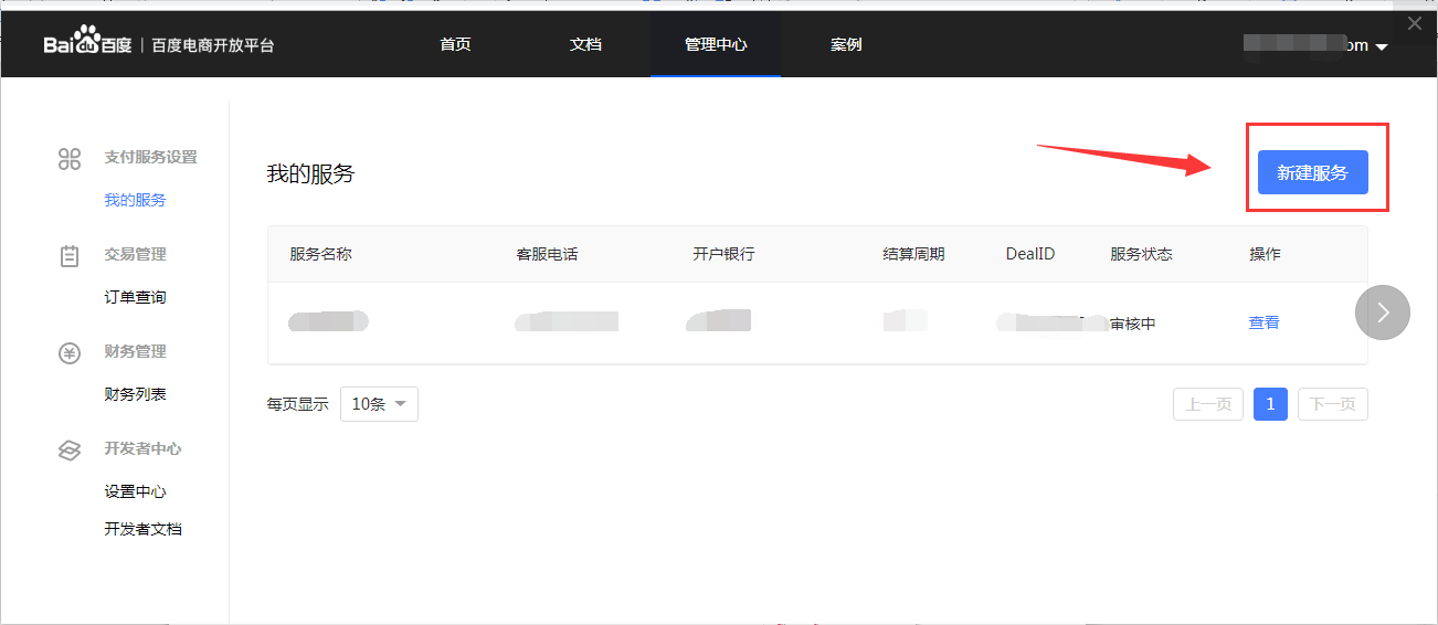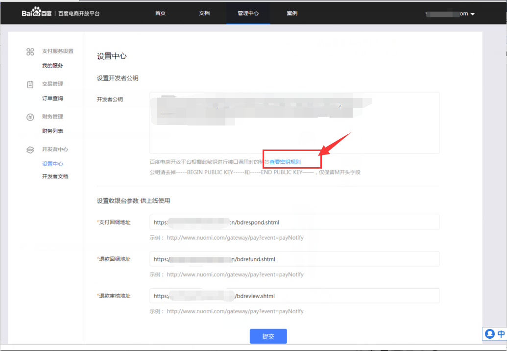 1.登录百度账号,在百度电商开放平台中-管理中心-支付服务设置-我的服务,点击“创建服务”填写相关信息,需要填写的公钥,点击下面的“查看密钥规则”根据说明获取,填写完成即可提交,提交后等待百度审核,点击查看,可以看到整体的信息,其他操作和百度小程序的标准版的操作一致这里不再赘述。