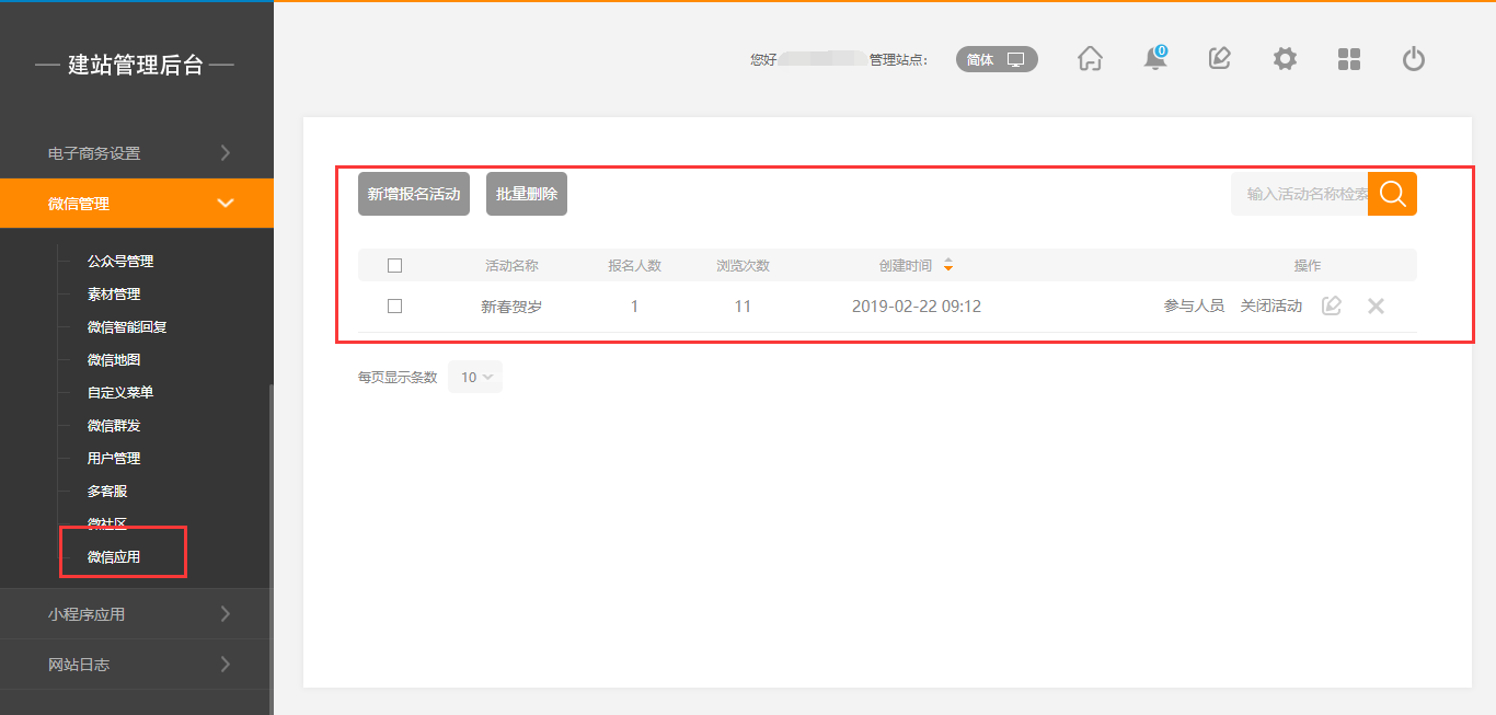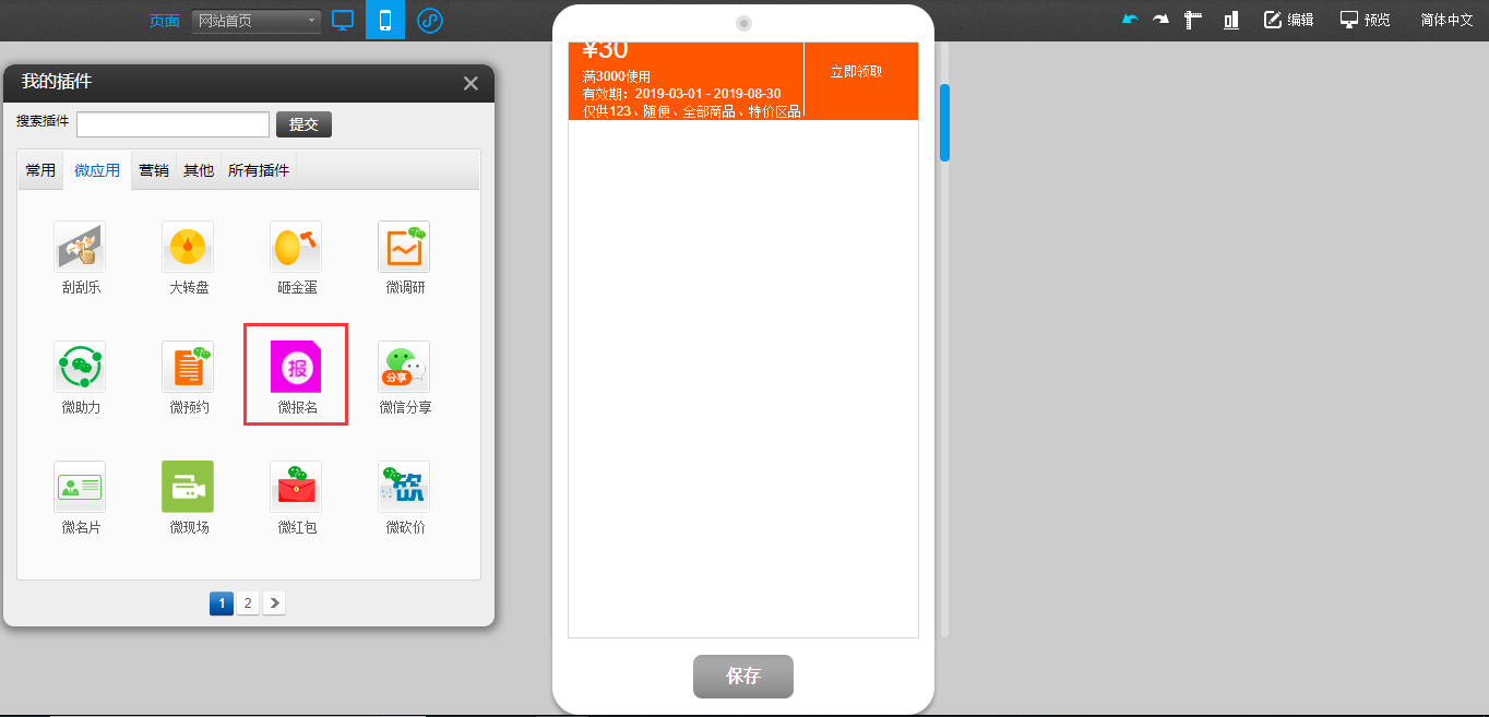 1.在编辑器中,拖入微报名插件,在后台微信管理-微信应用-微报名中添加报名活动,前台用户提交报名表单后,后台的操作在前台会员中心-我的消息中会有消息提醒,如图所示: