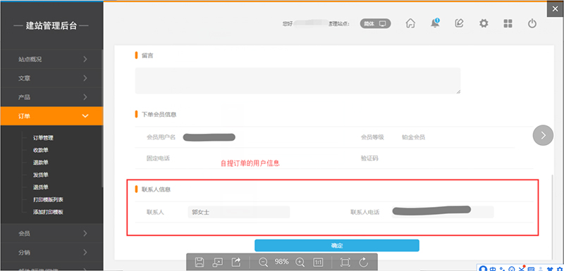 1.以手机版为例,在提交订单时,如果选择的为“用户自提”,需要客户填写相应的联系人与联系电话,在后台订单的编辑中,也会出现该条对应信息,如图所示: