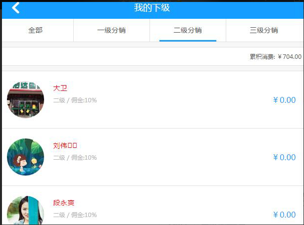 1.手机分销店铺-“我的下级”中获取了后台会员管理中用户的微信昵称以及头像,如图所示:
