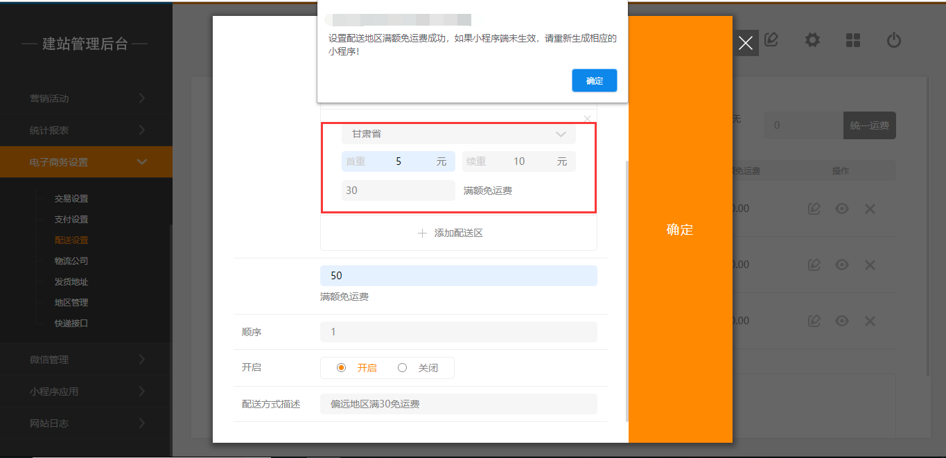 1.在网站后台,点击电子商务设置-配送设置,添加配送方式时,“支持配送地区”新增加了“满额免运费”,如果填写了这个填写项,则选择的地区就按照该项计算满额免运费,则不然就按照整体的满额免运费计算,如图所示: