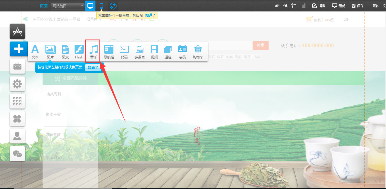1.在编辑器中点击文件,拖入音乐插件,PC版音乐插件改为H5模式,如图所示: